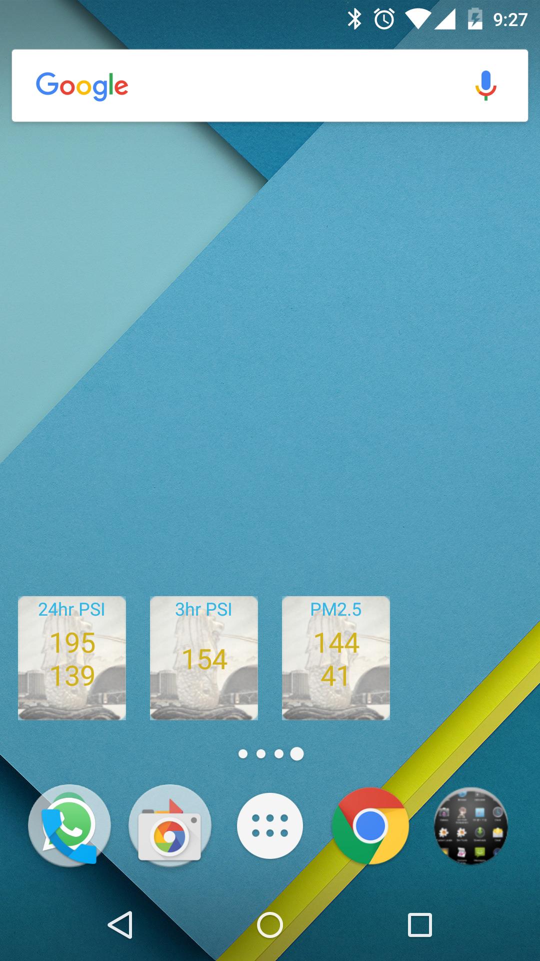 シンガポールで現在の3時間のPSI、24時間PSI、PM2.5の読み取り値を示すウィジェット。